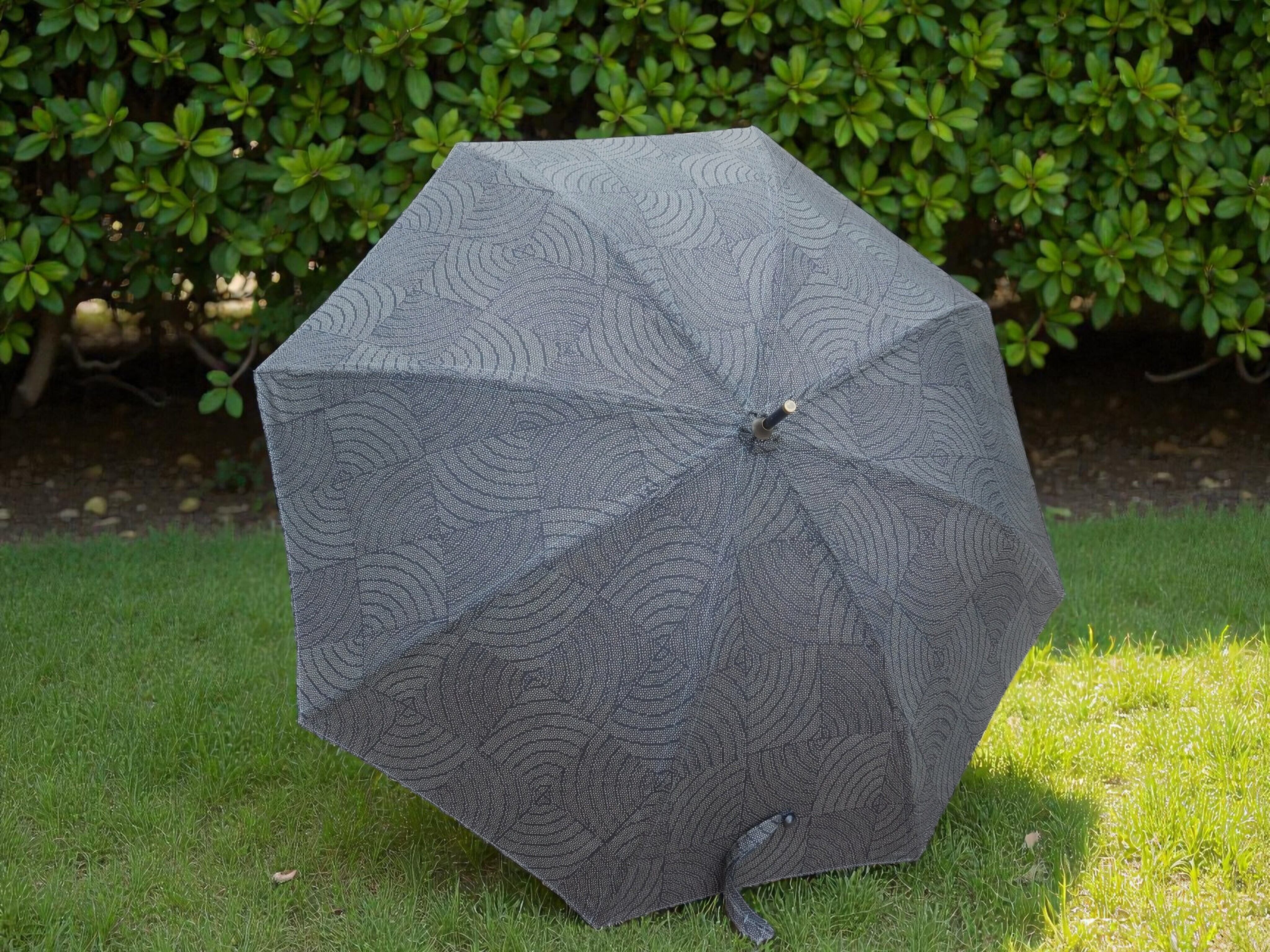 A remake parasol crafted from traditional Oshima Tsumugi kimono fabric.
